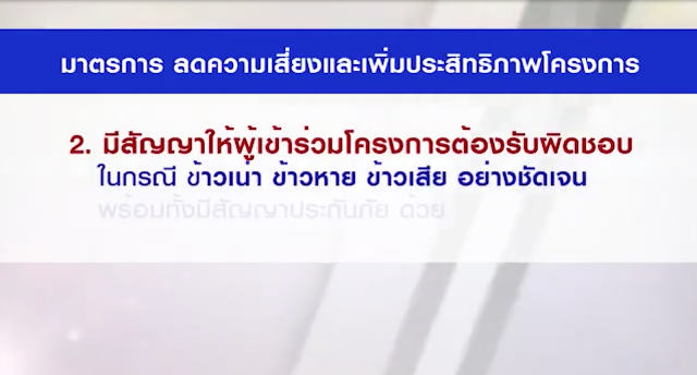 2. มีสัญญาให้ผู้เข้าร่วมโครงการรับผิดชอบ กรณี ข้าวเน่า ข้าวหาย ข้าวเสีย ชัดเจน พร้อมมีสัญญาประกันภัย